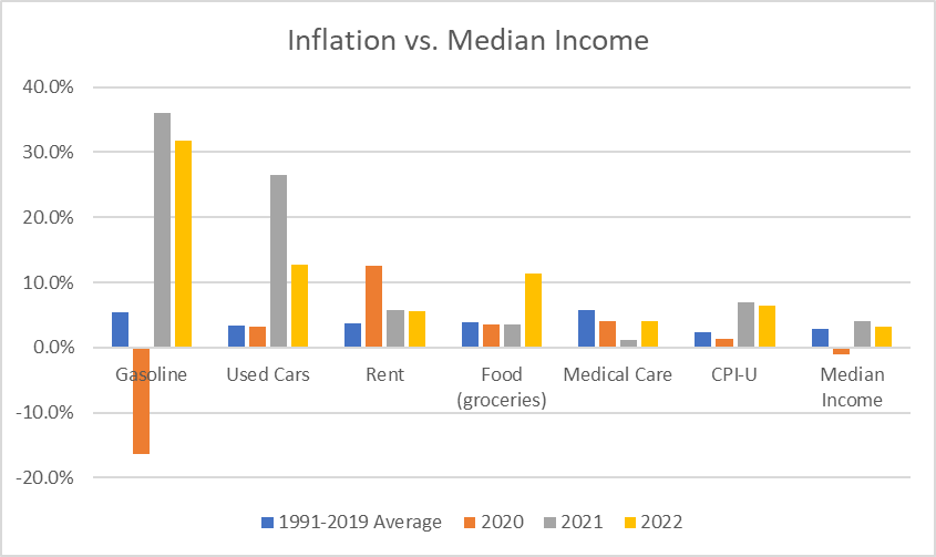 In the following chart[iv] I took select components of the Consumer Price Index (CPI), comparing the historical average annual price increase from 1991 to 2019 with the increases in 2020, 2021 and 2022. Together these five components comprise just over 30% of the CPI. (The BLS website details the components of the CPI). The chart also includes the average annual increase in median income during the same period.