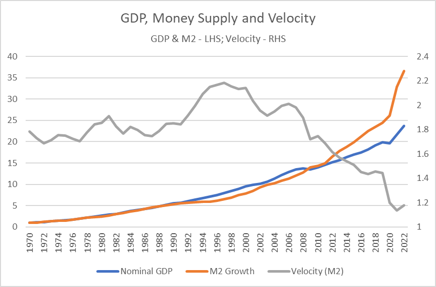 The following chart[iii] compares GDP growth, growth in the money supply, and changes in velocity from 1970 through the end of 2022.